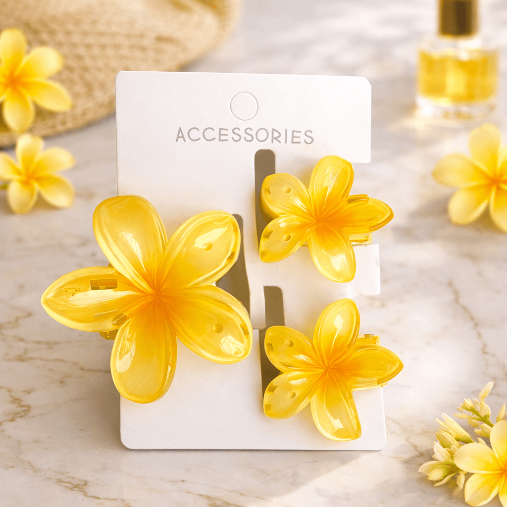 A glossy plumeria hair clip trio designed to add a soft, elegant statement to any hairstyle — perfect for everyday styling or special occasions.
