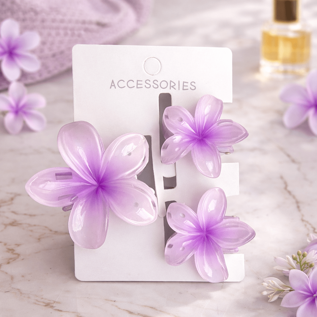 Inspired by tropical florals and effortless beauty, this 3-piece plumeria clip set blends delicate detailing with a smooth glossy finish. Lightweight yet eye-catching, these clips elevate braids, half-ups, buns, or open hair with a graceful floral touch. A versatile accessory that works beautifully for vacations, brunch dates, festive looks, or daily styling.